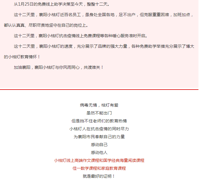 谁也没想到2020年的春节 以这样一种形式出现在大家面前 当大家买了新衣服、精心准备了年货 开心地准备走亲访友时 却又满脸惊惶的退回了家门 春节 这个阖家欢乐、欢腾热闹的日子 整个湖北省却静悄悄的 像一座空城 疫情暴发最严重的武汉 风吹草动都牵动着全国上下的心 钟南山院士前一天还在说:大家带好口罩,尽量不要出门。 第二天,口罩就卖断货了 第三天就封城了 第四天、第五天...... 不止是武汉 湖北省大大小小的地级市 都开始封路、封锁交通 看着感染的人数从几十、到几百、几千 到现在的两万多 从发热到疑似到危症 最后到重症 这些我们每天都要面对、要承受 并自我心理建设一遍 而我们只是在后方普普通通的百姓 病毒来了,疫情爆发了,交通封锁了 是医护人员奔走在一线为我们守住生命的底线 是警务人员巡视设卡为我们阻挡病毒的扩散 是小吃店老板固执地开着门提供温暖的食物 是埋头苦干的“基建狂魔”打造出火神山雷神山医院 危难当头 是这些逆行者们为我们撑起了自由呼吸的蓝天 在战场外面 总有可爱的人用爱建起桥梁 无数平凡的人温暖着世界 而在教育行业兢兢业业了十几年的襄阳小桔灯学校 身上也系着几千名学生的期盼与等待 ![]() “把最纯粹的教育献给最可爱的孩子” 危难之际 小桔灯虽然不能像一线的医护人员、警务人员一样 坚守在疫情一线 但也做了这次疫情里温暖的逆行者 战斗在教育的一线—— |